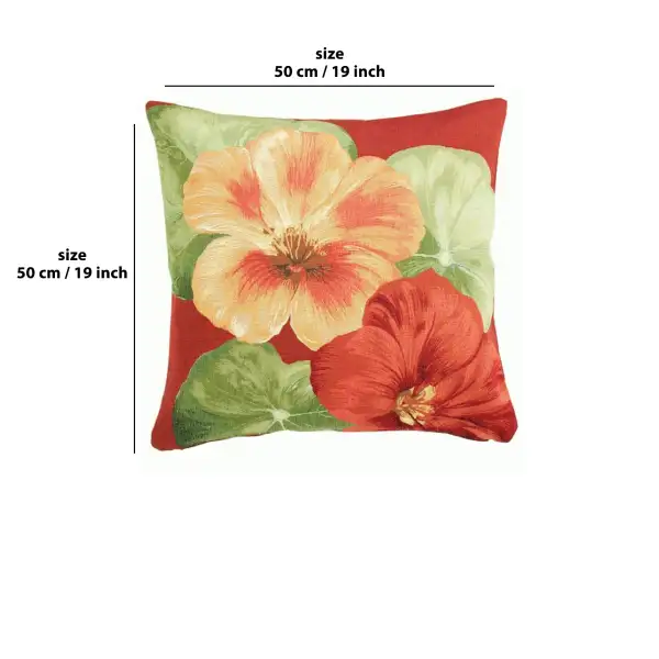 Soft watercolour imagery on a primary red backdrop conveys vividness to this depiction of Nasturtiums that brings a sense of allure and delicate beauty to your home decor motif. This European fine art tapestry cushion cover is artisan crafted by the finest loom working textile artists.