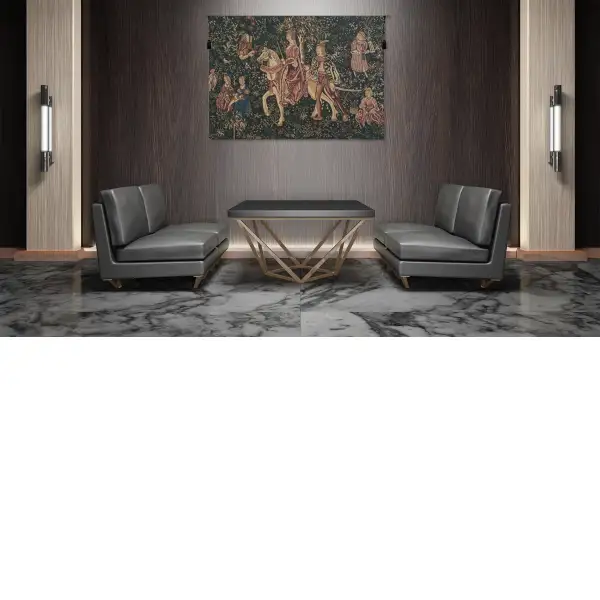 Noble Amazon (La Noble Amazone) Belgian tapestry tells the tale of a noble lady on horseback traveling in the company of a young lord.