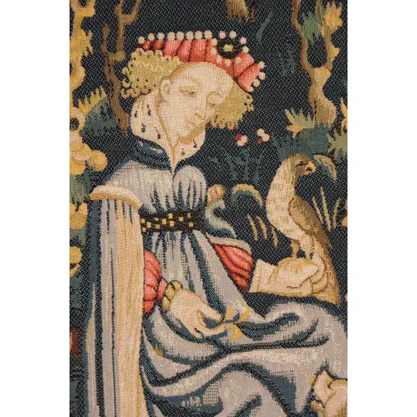 This is a reproduction of the tapestry known as "Offering of the Heart," dating back to the early 15th century (1400-1410), a remarkable piece woven in Arras and now housed in the Louvre Museum. This tapestry captures a poignant and romantic scene where a male figure in a rich red robe offers his heart to a seated female figure in a flowing blue dress. A joyful dog leaps at the woman, who holds a bird in her hand, while rabbits frolic nearby, adding playful innocence to the scene. The background, filled with lush trees, grasses, and flowers, creates a vibrant natural setting. The color palette of shades of blue, tan, muted red, and orange blends harmoniously, evoking a serene visual experience. The Jacquard weaving technique used in France showcases exceptional craftsmanship and artistic skill. "Offering of the Heart" exemplifies the sophistication and emotional depth of historical French tapestry weaving.