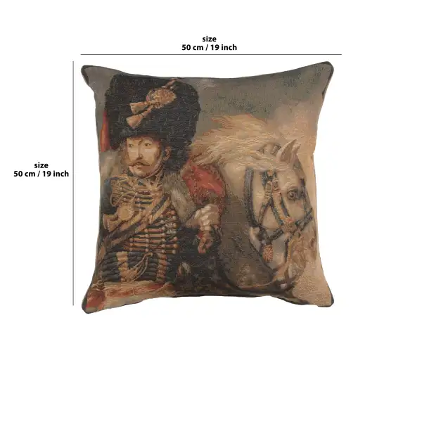 Officer of the Guard, or Cavalier de la Garde, is a jacquard tapestry cushion case over inspired from the famous masterpiece called, The Charging Chasseur, which was painted by Theodore Gericault in 1812. Gericault was an emblematic artist of the Napoleon era.