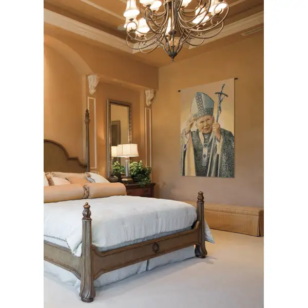 Papa Wojtyla Pope John Paul II is an Italian jacquard wall tapestry. It depicts Pope John Paul II in his full papal vestments. He was elected by the second Papal conclave of 1978 and served as Pope until his death in 2005. In the years since his death, John Paul II has since been made a saint by the Church. John Paul II is recognized as helping to end Communist rule in his native Poland and eventually all of Europe and for significantly improving the Catholic Church's relations with Judaism, Islam, the Eastern Orthodox Church, and the Anglican Communion.