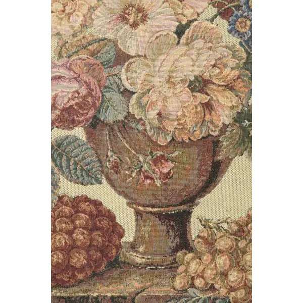 For anyone fortunate enough to have taken a French class in high school, then you know only too well that the pansy gets its name from the word “Pensee”, which means “thought”. The pansy got its name because it looked a bit like a human face. And during the month of August, it looks as if it’s in deep thought. In this piece, the ornate vase holds a colorful array of a careful arrangement of flowers, which are very pleasing to the eye. The vase is set inside a leaf border which complements the overall design.