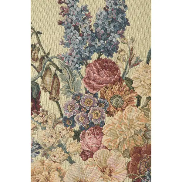 Pensee Italian woven tapestry features a heightened look at the pansy flower.