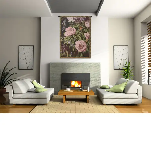 Pink Peonies is an Italian jacquard wall tapestry. This vibrant close up view of peonies is very detailed and shows all the stages of bloom of the flowers. Iris and star flowers also embellish the background along with a view of a verdant garden.