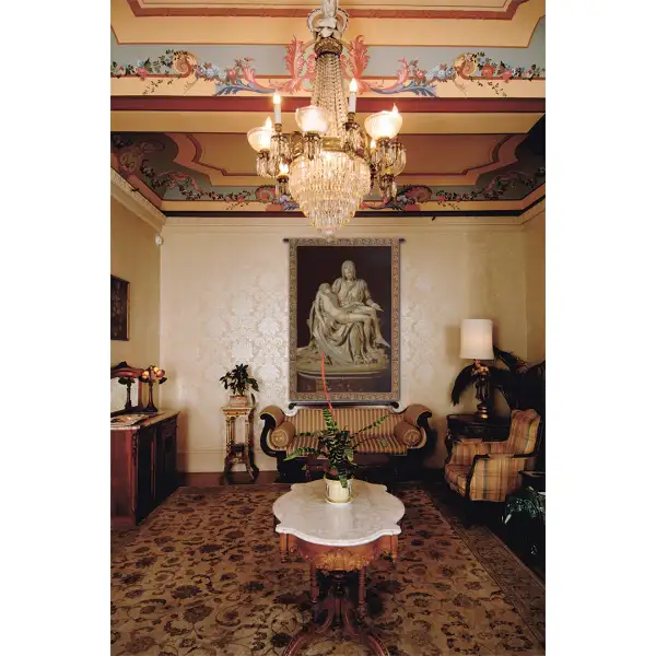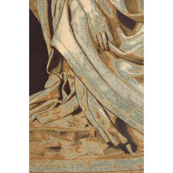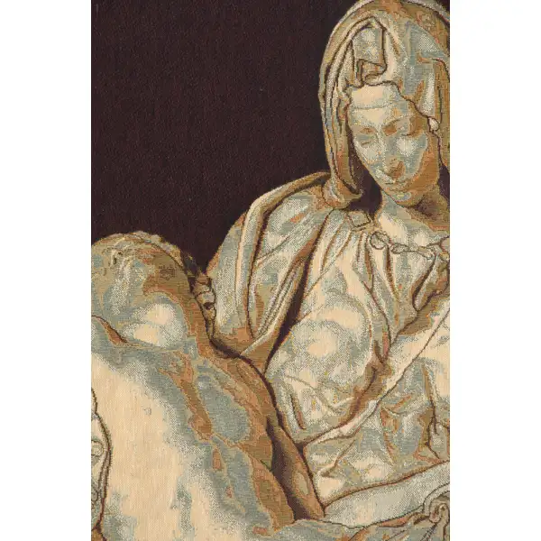 Pity by Michelangelo is an Italian jacquard wall tapestry. The Pietà is a subject in Christian art depicting the Virgin Mary cradling the dead body of Jesus, most often found in sculpture. This artwork depicts the renowned statue, Pietà, by Italian Renaissance Master, Michelangelo. It is located in St. Peter's Basilica in the Vatican City. The body of Christ is different from most earlier pietà statues, which were usually smaller and in wood. The Virgin is also unusually youthful, and in repose, rather than the older, sorrowing Mary of most pietàs. She is shown as youthful for two reasons; God is the source of all beauty and she is one of the closest to God, also the exterior is thought as the revelation of the interior (the virgin is morally beautiful).