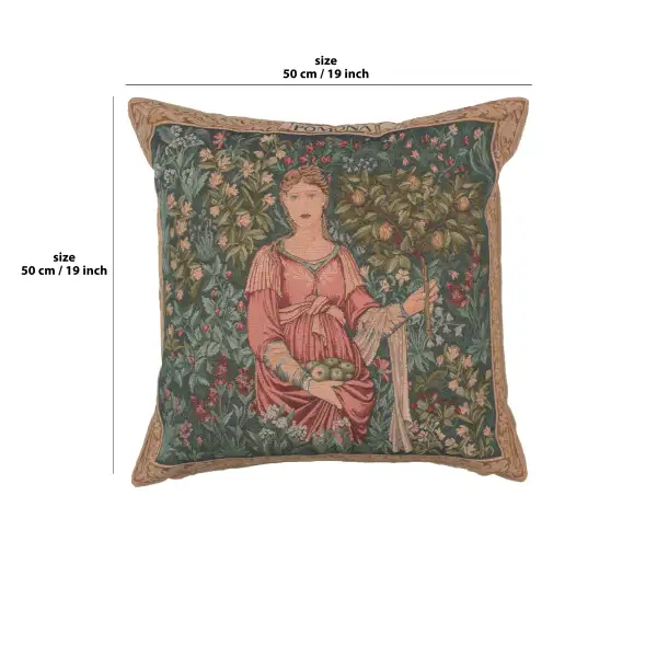 Pomona I: This European jacquard tapestry cushion cover is one of the many versions of the Autumnal figure, Pomona, designed in the 1880's by William Morris and Edward Burne-Jones.