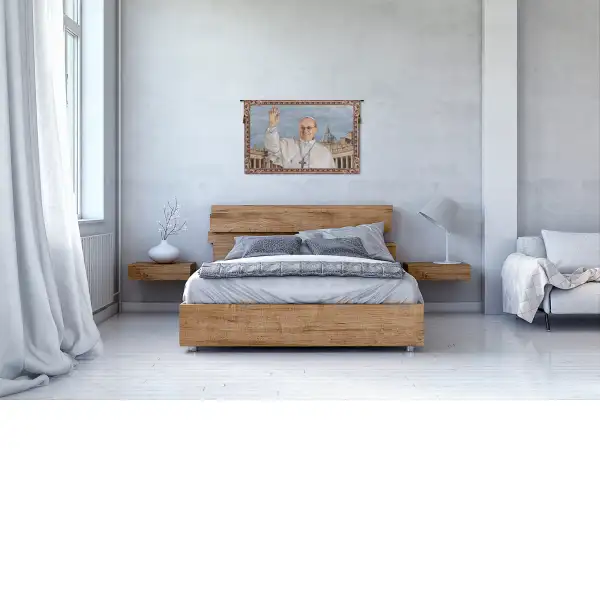 Pope Francis Italian woven tapestry features an iconic image of Pope Francis born Jorge Mario Bergoglio, 17 December 1936, the Catholic Church's Pope. In this image we see the Pope waving with an image of Vatican City State in the background.