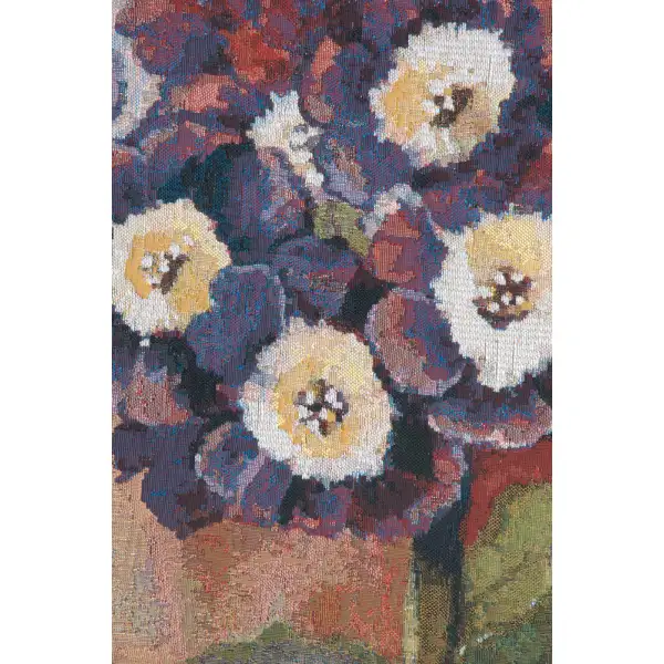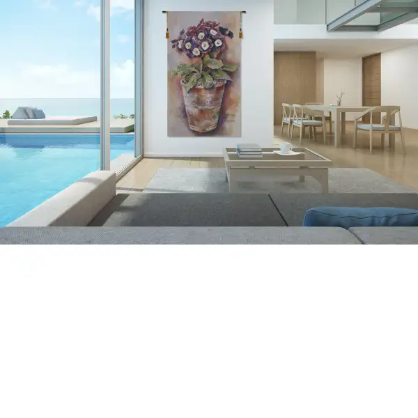 Primula is a Belgian made jacquard wall tapestry. It features a cheerful potted Primula Auricula with purple blooms on a light background. Great for kitchen decor.