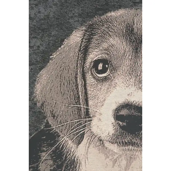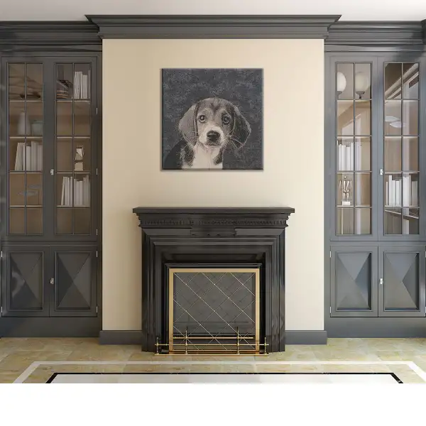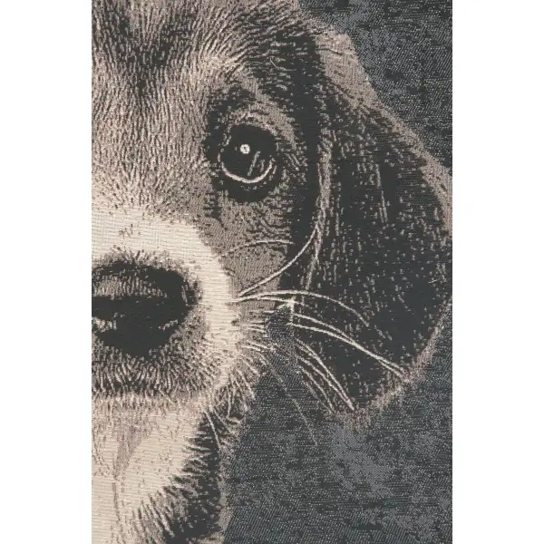 Enough to make the most rigid person exclaim in awe, this tapestry panel depicts the one thing that no one can stay mad at; Puppy Dog Eyes. This monochromatic stretched wall panel piece has a classic vintage feel and adds an air of softness to any room.