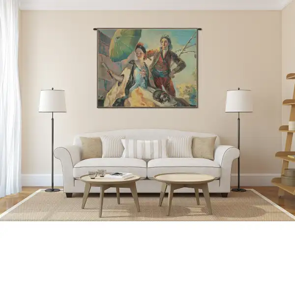 This Belgian wall tapestry, Quitasol, is a reproduction of a painting by Francisco Goya, a Spanish romantic painter, in 1776. This piece was part a series that were commissioned to Goya for the Dining Room of the Prado Palace. The fresh and warm coloring, the damsel responding to gallant flirtation, and the illuminated background make this one of Goya's most cheerful paintings.