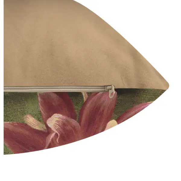This beautiful flower will embellish your home. Red Star Flower is woven in the jacquard style. This floral tapestry cushion cover is a detailed botanical representation of a star shaped flower on a green background.