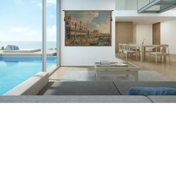 Riva Degli Schiavoni, or Schiavoni Riverside, is an Italian jacquard woven wall tapestry. It renders a view from an 18th century painting of the famous location in Venice. The Riva Degli Schiavoni is a lovely and lively promenade that sits on the waterfront at St. Mark's Basin in Venice. It commences outside the Doges Palace and ends near the Arsenal.It was originally built in the ninth century from dredged silt and was named for the Slavic men who brought cargo to Venice from across the Adriatic Sea.