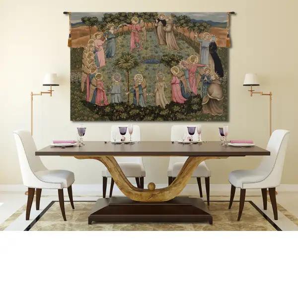 For those who love the beauty of historical religious and theological art, the Roundance of Saints Tapestry is sure to illuminate your home and heart. Inspired by The Last Judgement by Renaissance artist Fran Angelico painted in the Church of Santa Maria degli Angeli between 1425 to 1231. This excerpt depicts the angels that lead the saved through the garden to the gates to Heaven during Christ’s days of judgment. The woven colors are glorious, as is the story the tapestry tells. Backed with lining and tunnel for easy hanging.
