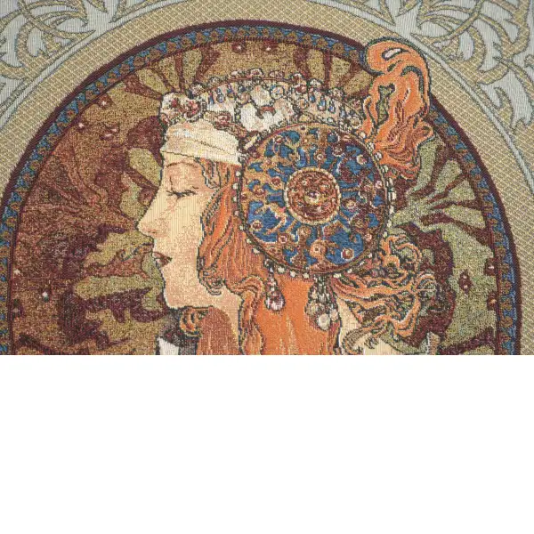 Our Rousse Cushion Cover boasts the art deco beauty of Alphonse Mucha’s Byzantine Head Blond Panels. The photographer created the panels in 1897 by dressing his models in luxuriously embroidered, woven, and bejeweled clothing of the Byzantine Empire. His works were framed in art deco style detailing and became so popular they have been reproduced in all art mediums still to this day. Our replication is in woven tapestry created in luxe viscose and cotton thread in gorgeous hues. Our tapestry cushion cover brings stylish touch of femininity to your home. The cover is backed in a solid fabric with zipper closure. Woven in France.