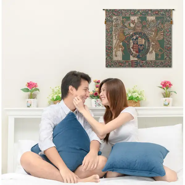 Royal Arms of England is a Belgian made jacquard woven wall tapestry. The artwork comes from a tapestry of the "Burrel Collection" in Glasgow and represents the reign of Edward the VI and Elizabeth I.