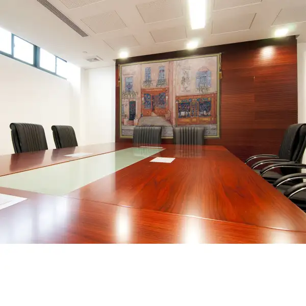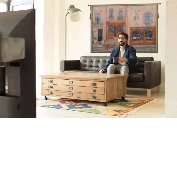 Sagot Terrasse is a jacquard wall tapestry from Belgium. The scene features an enchanting cityscape scene from Paris. In the foreground a charming wheelbarrow of flowers outside a Boulangerie or bakery and a Gallery. The residents of the street are living on the floors above, with flowers and greenery decorating their windows. This quaint scene celebrates the importance of the small charming shops which contribute to the ambiance of the Parisian social life.