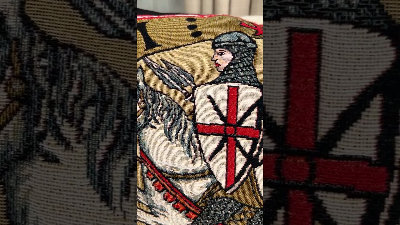 Sceau Templier I woven European tapestry panel features a medieval crest containing a white horse with two knights riding in the center.