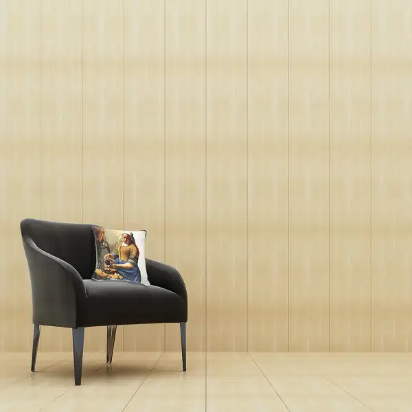 Servant Girl I is a Belgian impressionist tapestry cushion cover piece inspired by Johannes Vermeer's, The Milkmaid (c 1658-1661). It is speculated that the maid in the painting was Tanneke Everpoel, the Vermeer household's maid whom the Vermeer family respected and admired. Vermeer used the semi-precious stone lapis lazuli to get such an intense blue in the skirt.
