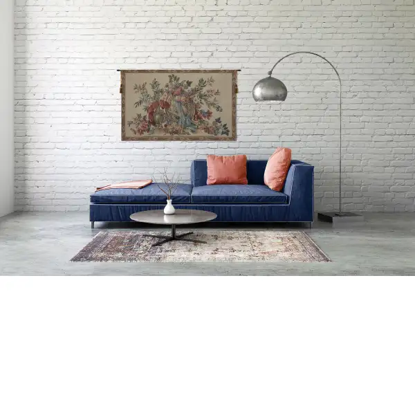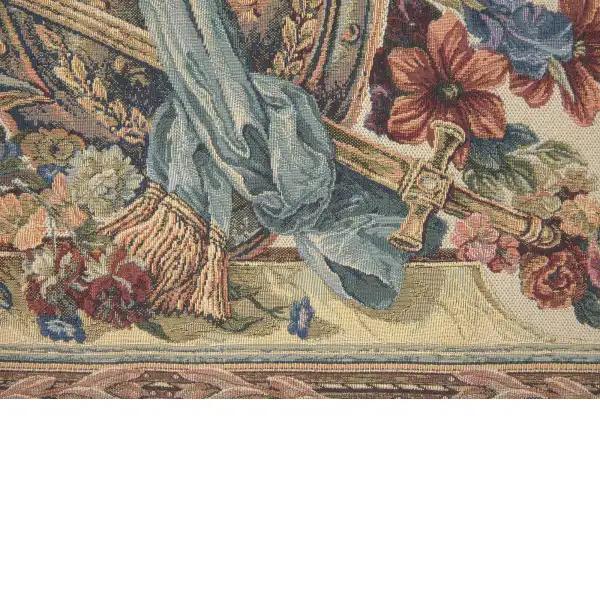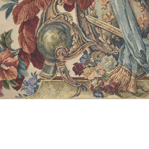 Crest and Shield Italian woven tapestry features a still life image. In this stunning tapestry we see a silver shield, sword and helmet surrounded by an array of fruit and leafy foliage. This scene is completed with a beige background and ornate gold border.