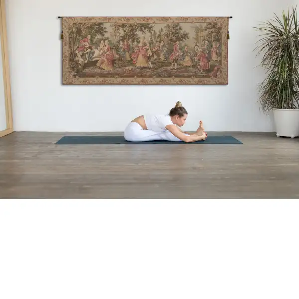 Society in the Park is a Belgian made jacquard woven wall tapestry. The artwork is a rendering of a work by François Boucher (1703 – 1770), a French painter in the Rococo style. Boucher is known for his idyllic and voluptuous paintings on classical themes, decorative allegories, and pastoral scenes. He was perhaps the most celebrated painter and decorative artist of the 18th century.