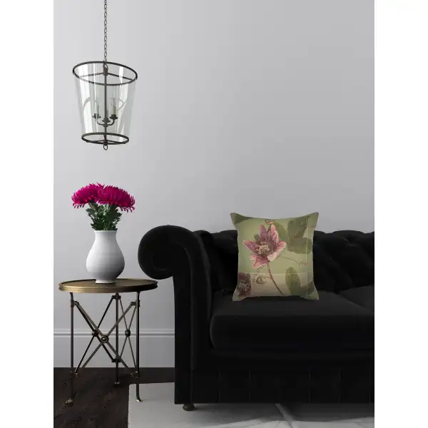 Springtime Blossom Green is a European jacquard tapestry cushion cover with a beautifully detailed pink and red flower.