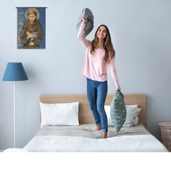 St. Francis From Assisi is an Italian jacquard wall tapestry. This is from an early painting of St. Francis of Assisi, the patron saint of animals and the ecology; a Roman Catholic saint who took the gospel literally by following all Jesus said and did. His feast day is celebrated on October 4.