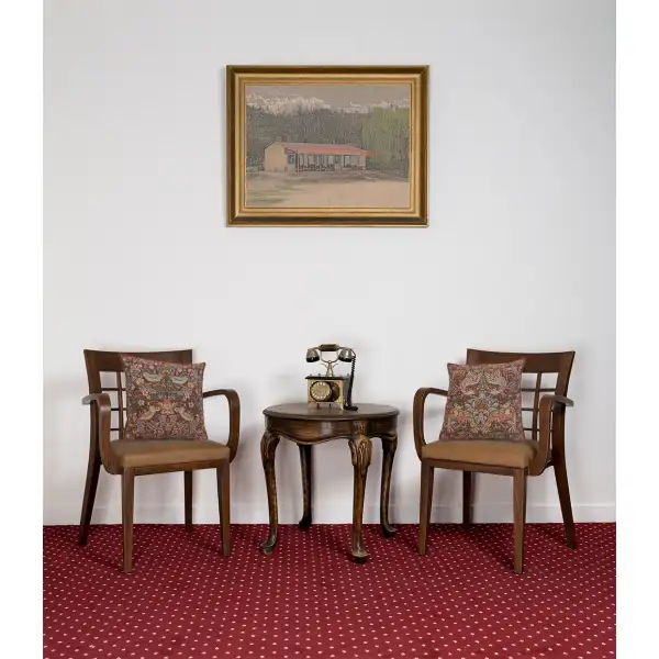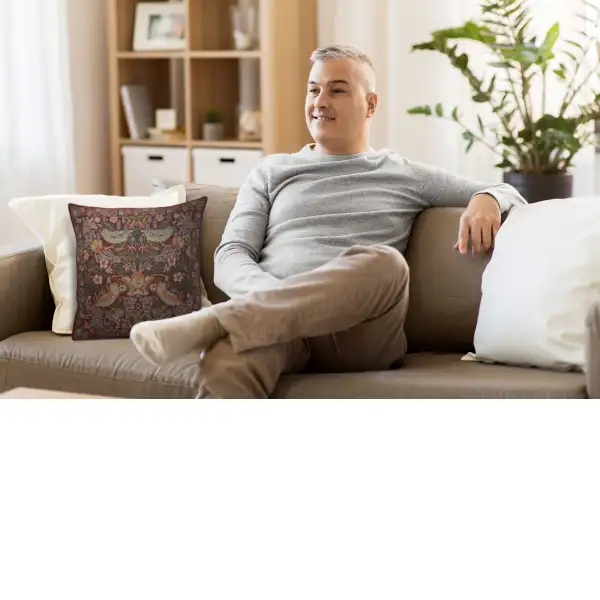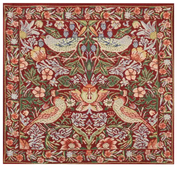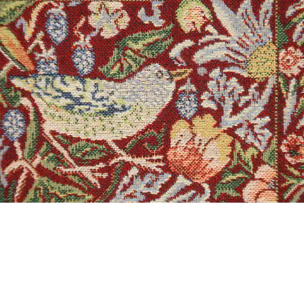 Fall into a magical nature scene with mischievous birds stealing berries right from the vine. Taken from a tapestry designed by William Morris in the late 1800s that includes the extract of the birds in the wild on this delightful cushion cover. The period inspired tapestry design depicts colorfully feathered birds perched on strawberry vines set against wild bushes and greenery. Morris founded the British arts and crafts movement during the late 1800s. Makes a sweet decorative accent on the bed or sofa. Cushion cover backed with lining and zipper. Infill not included. Woven in France.