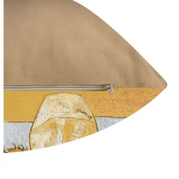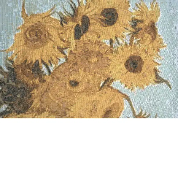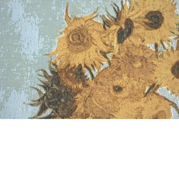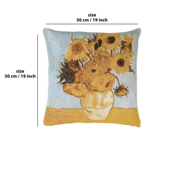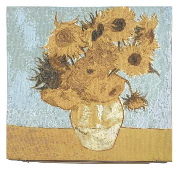 Sunflowers by Van Gogh is a French jacquard woven tapestry cushion cover. The artwork is a reproduction of Vincent Van Gogh's oil painting Twelve Sunflowers in a Vase. It was painted at Arles in August 1888 and is now in a Munich museum. It is part of a set that he completed between 1888 to 1889, consisting of seven paintings representing sunflowers in all their life-cycle, from flowering to wilt.