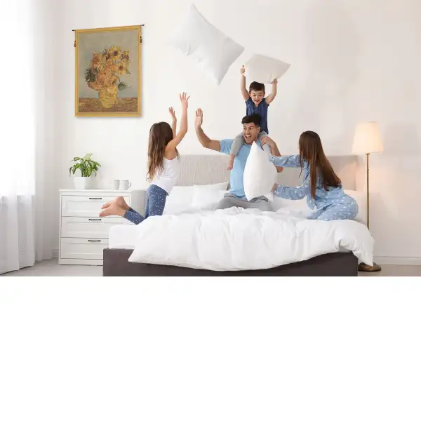 Sunflowers by Van Gogh I is a Belgian jacquard woven wall tapestry. A reproduction of Van Gogh's oil painting Twelve Sunflowers in a Vase. It was painted at Arles in August 1888 and is now in a Munich museum. From 1888 to 1889, Vincent van Gogh realized seven paintings representing sunflowers in all their life-cycle, from flowering to wilt.