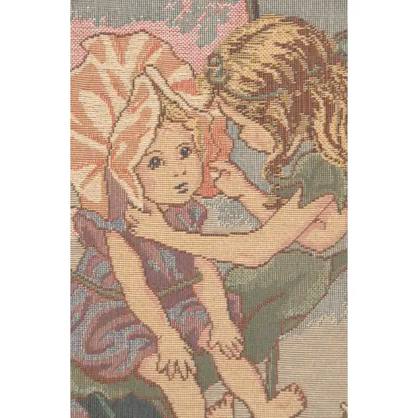 An adorable scene featuring two fairies sitting among the flowers. The older female fairy is adjusting the hat on the toddler fairy.This panel features the classic whimsy of Cicely Mary Barker.