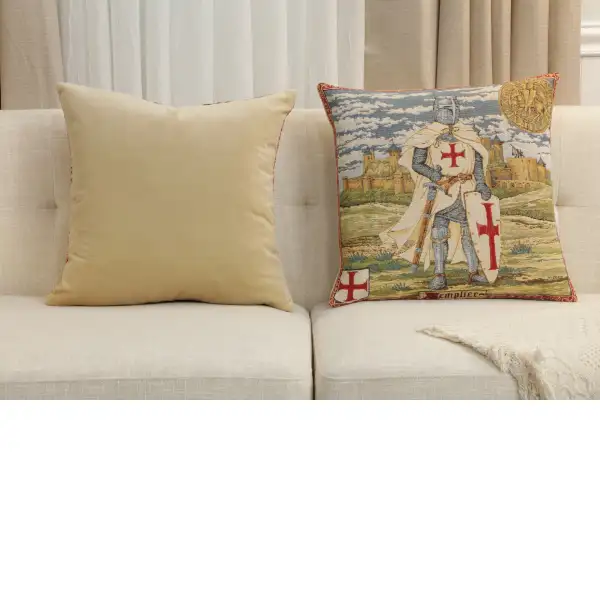 Templier II woven European tapestry cushion cover features a portrait style view of an 18th Century Knight. Complete with body armour and matching shield adorned with a red cross. The knight stands proudly with the castle in the background.