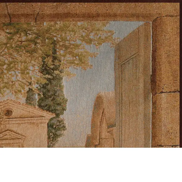 "Terrace in Provence" transports viewers into the heart of rural France, framed by a rustic window. Within the courtyard, a serene fountain, intricately adorned, whispers tales of ancient Provencal life. Sitting chairs invite quiet contemplation amidst fragrant roses and potted plants, their charm enhanced by a nearby watering can. In the backdrop, a weathered storage building stands as a testament to time, while beyond the stone walls lies the picturesque French countryside. Muted tones of tan, green, and blue dominate, capturing the essence of Provence's timeless allure. This jacquard-woven masterpiece, crafted in France, evokes nostalgia for lazy afternoons amidst nature's embrace. "Terrace in Provence" is not just a tapestry but a gateway to a world where simplicity and beauty intertwine, inviting viewers to savor the tranquility of rural life.