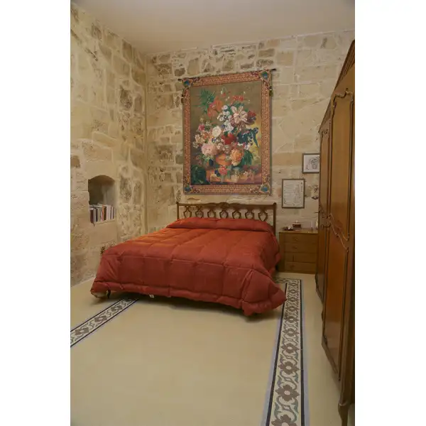Terracotta Floral Bouquet is a Belgian wall tapestry based on a design by Jan van Huysum for the Duke of Mecklenburg circa 1740. Huysum (1682-1749) was a famous Dutch painter known as the most distinguished flower painter of his time several of his works are on display at the Louvre in Paris. His style was much imitated: the light colours he used, the even lighter backgrounds, and the openness of his intricate compositions became distinguishing features of 18th century Dutch floral still life painting.