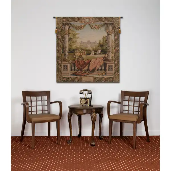 Terrasse Au Chàteau, or Terrace Chateau, is a jacquard woven wall art tapestry that features a terrace view of a typical 17th century castle.