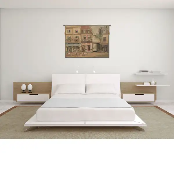 Terrasse Parisienne, or Parisian Terrace, is a Belgian jacquard wall tapestry portraying s a lively Parisian terraced arcade. In this charming work, we see life in city-side Paris, where shops and social life merge. Here we see a hotel and restaurant where tables are displayed outside for visitors to bask and enjoy the day in the sun. The color palette in this work is delicate and balanced, filled with pastels. This charming work invites the viewer into a romantic vie of daily life in Paris.
