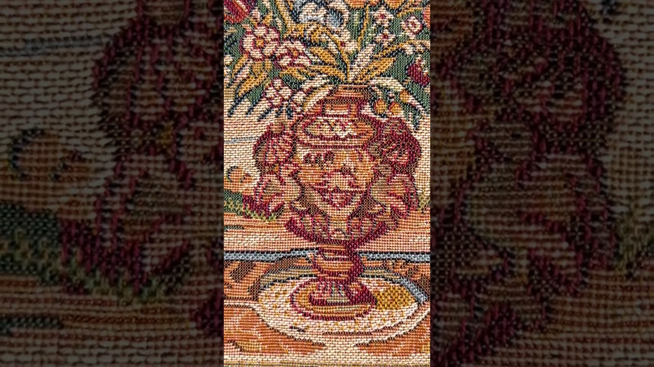 This elegant European jacquard tapestry panel, Terrasse with Columns, is a reproduction of one woven in Antwerp in the early 17th century. It represents a bouquet of flowers in a copper bowl surrounded by columns and green foliage. It has an arabesque border and is also known as Terrasse, Beige.