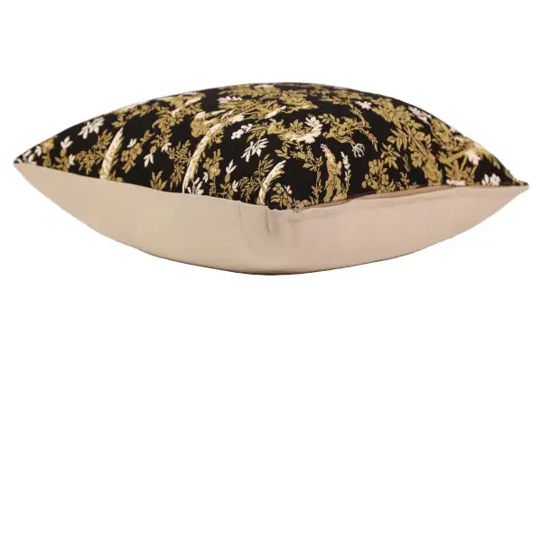 Immerse yourself in the refined beauty of French decorative arts with our jacquard woven cushion cover, showcasing the enchanting scene of "The Chinese on a Wheelbarrow" on a striking black toile de Jouy tapestry. The scene, depicted with meticulous detail, transports you to a bygone era, where figures in traditional Chinese attire converse amidst a serene backdrop. Against delicate white and brown foliage on black canvas, the scene emanates tranquility and sophistication.