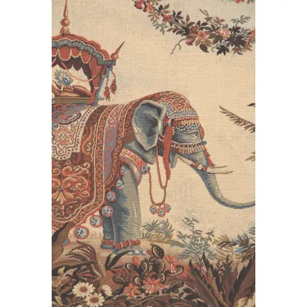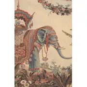 The Elephant is a European jacquard wall tapestry featuring an exotic Asian elephant covered with rich carpets and ornaments. The original design is from a famous 19th century tapestry on display in the Louvre Museum in Paris. It was woven at a carpet factory in Aubusson established by Alexis Sallandrouze, 1808-67. The design, attributed to Jean-Baptiste-Amédée Couder, 1797-1864, draws on a number of different sources. By introducing these exotic influences, the tapestry contributed to a revival of the decorative arts in France in the 1840's.