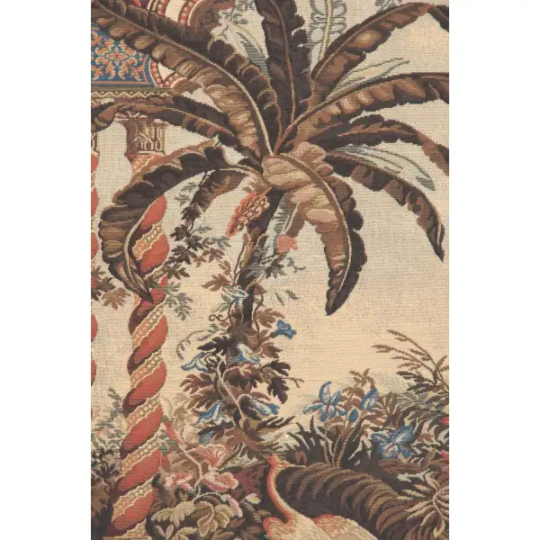 The luxuriant landscape is framed by pairs of twisted columns. The ornamental border is very rich, composed of a dense, complex tracery recalling the decorative vocabulary of Islamic architecture. Beyond this architectural frame lies a luminous landscape in which an Asian elephant can be seen passing between a palm and a banana tree. The elephant, richly caparisoned from top to toe. The tapestry may have been part of a set representing the continents.