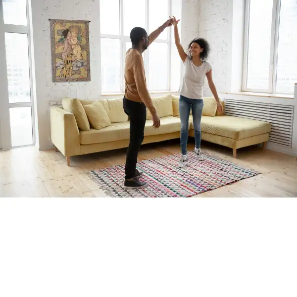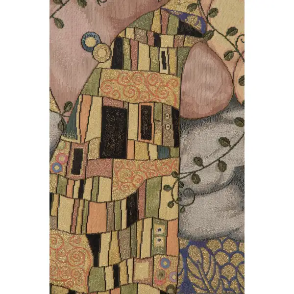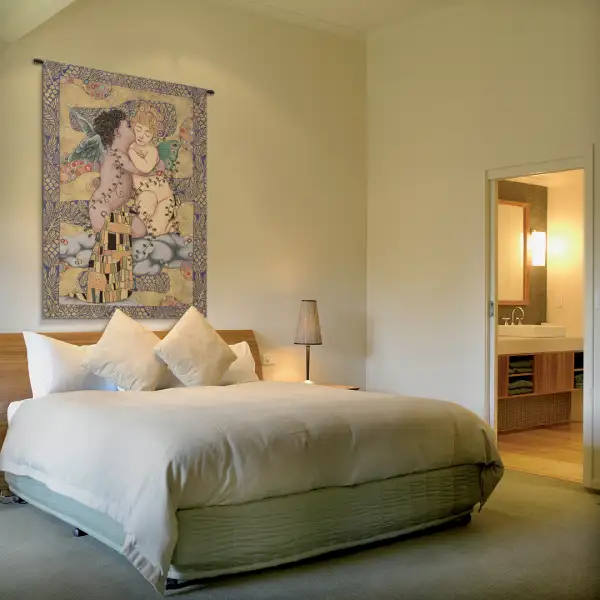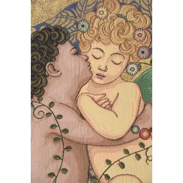 The First Kiss is an Italian jacquard wall tapestry. The artwork is Inspired by William Bouguereau's Cupid and Psyche as Children but incorporates the style of Gustav Klimt.