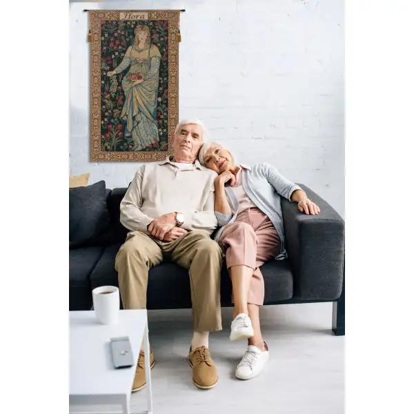 The Flora Belgian tapestry was created in 1885 by the wonderful combination of William Morris who was responsible for the background and Edward Burne-Jones who designed the figure. It was woven by Morris & Co at their Merton Abbey workshops and the original is now in the Whitworth Art Gallery in Manchester. Here we present a detail of it, without the verse and border. The tapestry is also available at The Tapestry House in its original design.