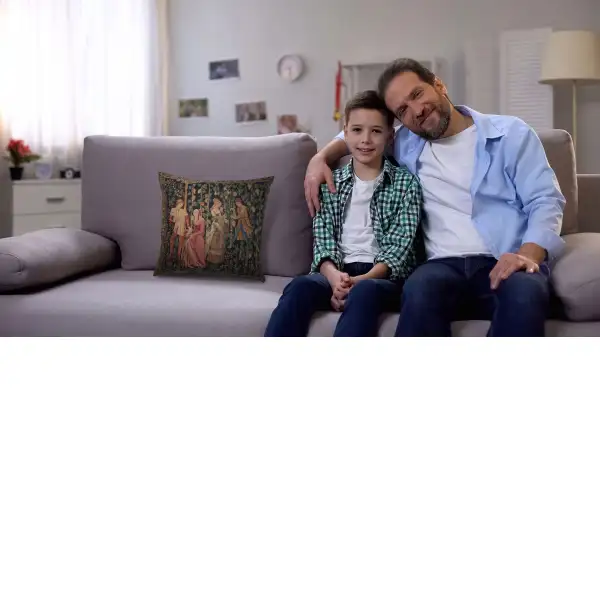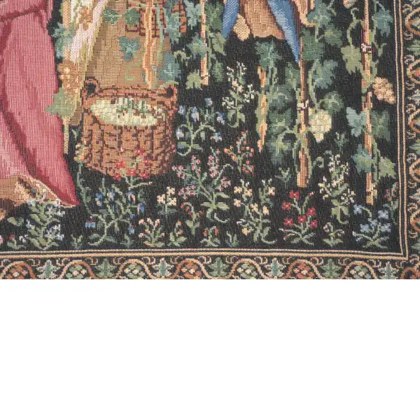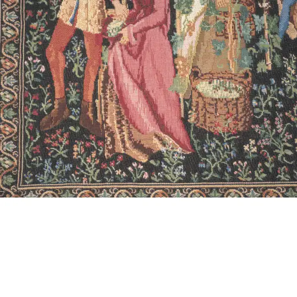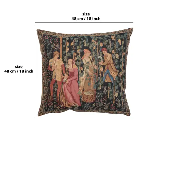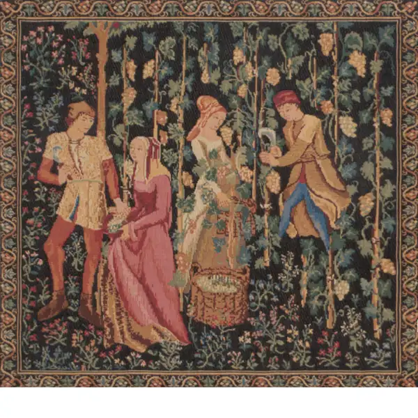 The Harvest II woven European tapestry cushion cover features a detail from the tapestry "The Vintage" based on the original from the region of Tournai in the 15th century, France. The remarkable scene shows the villagers in intricate attire gathering grapes for preparation for wine production and pressing. Here we see the interactions between the villagers as they go about the task of grape harvesting from the tall vines. The art of wine making developed rapidly in French countryside as knowledgeable wine makers made productive use of farm land in exchange for tithing of produce for the original land owner.