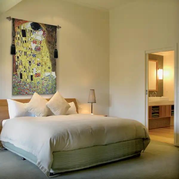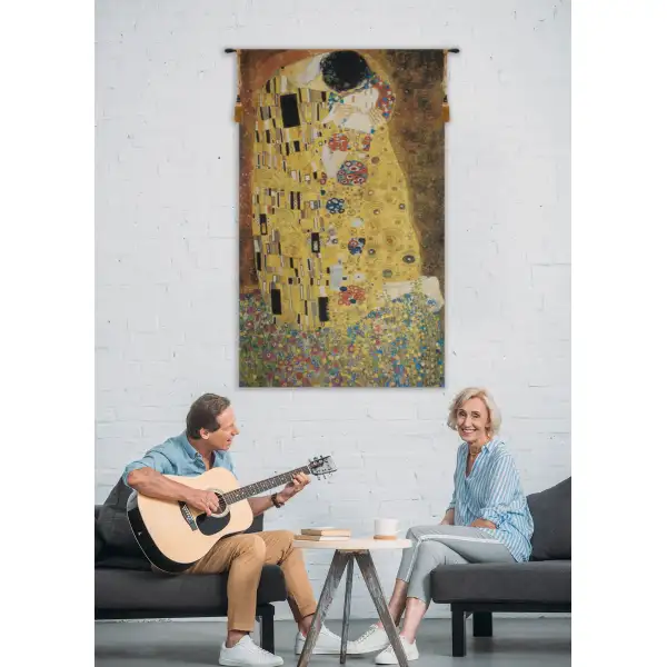 Gustav Klimt's The Kiss is a masterwork of 20th century art. It depicts two lovers, their bodies joined in an embrace as the man leans down to kiss his lady love. Their clothing and background feature eye catching geometric shapes and patterns in a composition that focuses on the more realistic depiction of the lovers' faces even as it draws the eye from top to bottom. The Kiss painting has become a popular subject for posters, canvas art reproductions and now wall tapestries. A perfect gift for a loved one.
