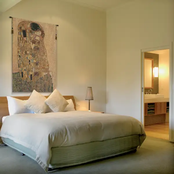 This jacquard woven wall tapestry, The Kiss II, is made in Italy. Gustav Klimt's The Kiss is a masterwork of 20th century art. It depicts two lovers, their bodies joined in an embrace as the man leans down to kiss his lady love. Their clothing and background feature eye catching geometric shapes and patterns in a composition that focuses on the more realistic depiction of the lovers' faces even as it draws the eye from top to bottom. The Kiss painting has become Klimt's most popular work.