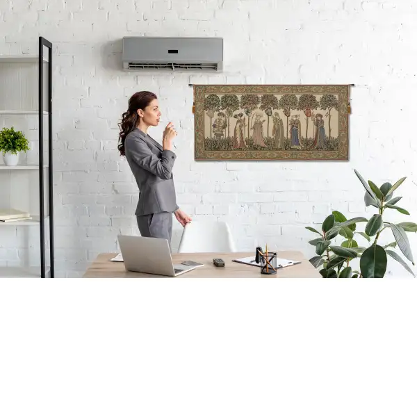 The Manta is a European jacquard wall tapestry also known I Nove Prodi, or the Nine Worthies. This tapestry is an adaption of the original fresco from the Master of La Manta (1420) an anonymous master, painted in the sala baronale of the Castello della Manta, Saluzzo, Italy. The series includes depictions of nine historical, scriptural and legendary personages who personify the ideals of chivalry as were established in the Middle Ages and their female counterparts. The best known character Godfrey of Bouillon who led the first Crusade from 1096 till 1099. He was proclaimed King of Jerusalem in 1100.