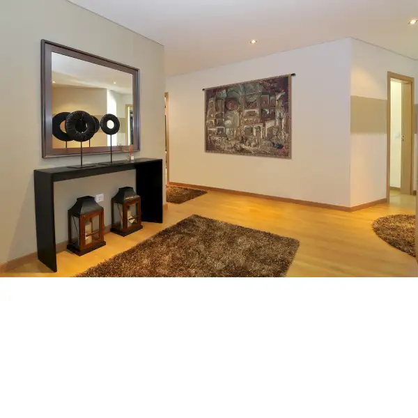 The Museum is an Italian jacquard wall tapestry. This image is a historical view taken from inside the Museum of Art in Italy and is based on a 1775 painting by Giovanni Paolo Pannini called "Ancient Rome".