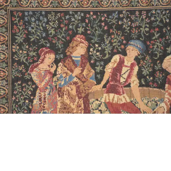 The Wine Press II woven European tapestry cushion cover features a medieval scene of grapes harvest and wine making. In this medieval scene we see the villagers crushing grapes with their feet to produce wine. The lady is seen collecting the wine from the large vat with a jug. Their costumes are elaborate, as they enjoy and revel in the spring time ritual of grapes harvest and the production of wine for all to enjoy.