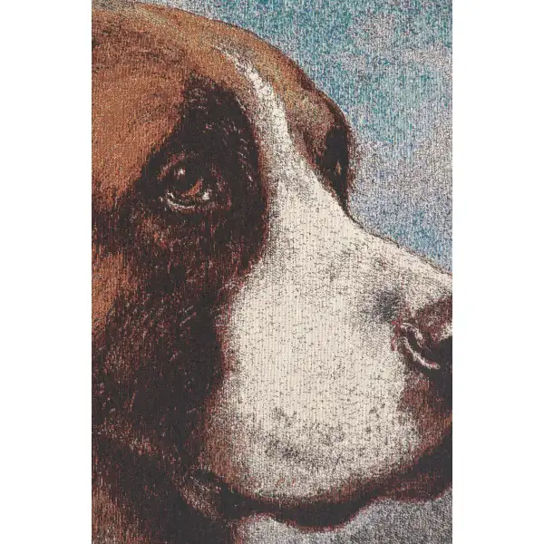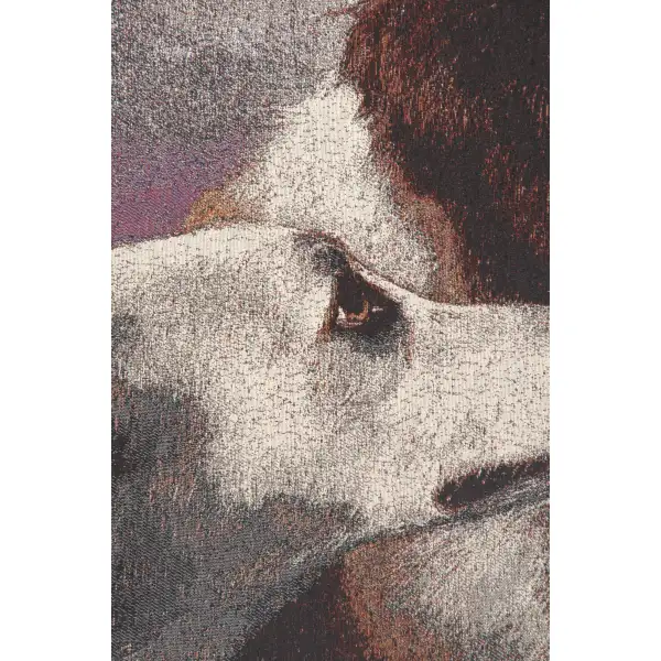 Trust is a woven tapestry stretched wall panel depicting two dogs side by side, the smaller one looking up toward the larger canine with a look of trust. This tapestry is a wonderful accent to your home, office, or cabin.
