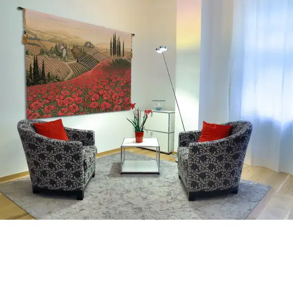 Tuscan Poppy Landscape is an Italian jacquard wall tapestry. This rich landscape scene brings depth and bold color to its composition. A fertile valley fills the background with an image of well tended crops and Italian villa houses. A thick carpet of red poppies populate the foreground to engage the viewer instantly.