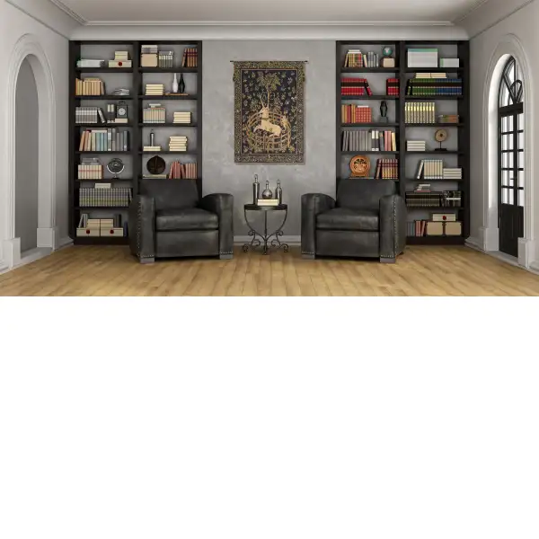 Unicorn in Captivity is a Belgian made jacquard woven wall tapestry. The artwork is a simplified rendering of a piece from the famous set of medieval tapestries called Chasse a la Licorne, or The Hunt of the Unicorn from the late 15th century; now on display at the Metropolitan Museum in New York. In the middle ages, this legendary animal was regarded as the symbol of purity. It is fastened by a golden chain to a tree bearing pomegranates, signifying marriage and fertility. The background is done in the millefleurs style upon a black backdrop.